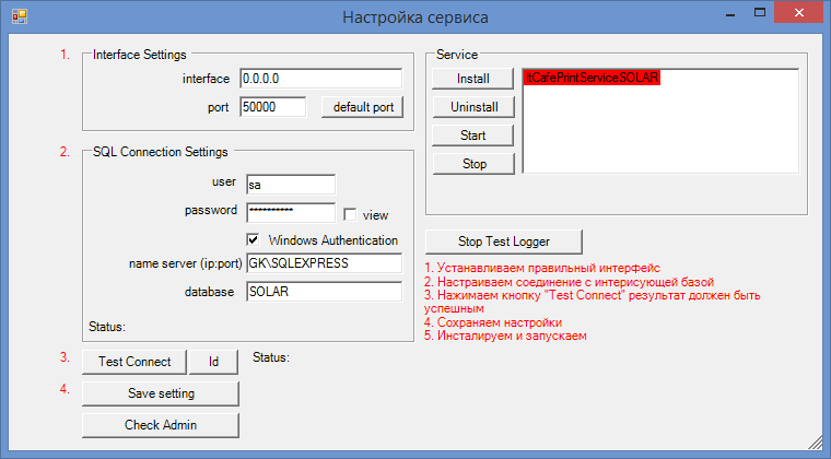 После распаковки запускаете Служба печати, файл PrintService.exe и Вам откроется следующая форма: