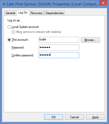 Мы ранее, на шаге № 1, создавали пользователя itcafe с паролем itcafe, тут его и прописываем, после чего перезапускаем Службу печати.