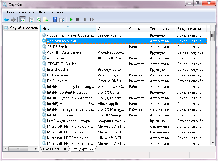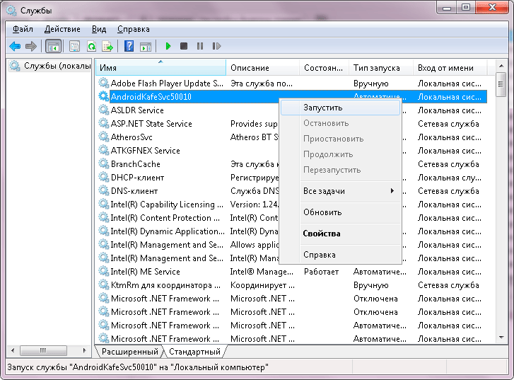 Окрыть список служб, через Панель управления/Администрирование/Службы, убедиться в наличии службы "AndroidKafeSvc_порт"