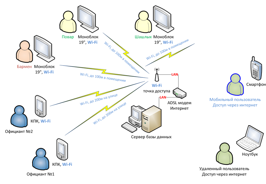 Оборудование устанавливаемое для ресторанного учета: Этому оборудованию мы уделим больше внимания, т.к. это куда более важная часть, чем видеонаблюдение. В нашем кафе следующие правила работы персонала: - бармен, принимает заказы и выдает заказы, инструмент - рабочая станция. - официанты, принимают заказы и выдают заказы, инструмент - карманный компьютер(pocket pc) - кухня, инструмент - рабочая станция, полученный заказ видит на дисплее, когда заказ выполнен, он отмечается кухней и информация о выполненном заказе поступает официанту(на карманный компьютер).